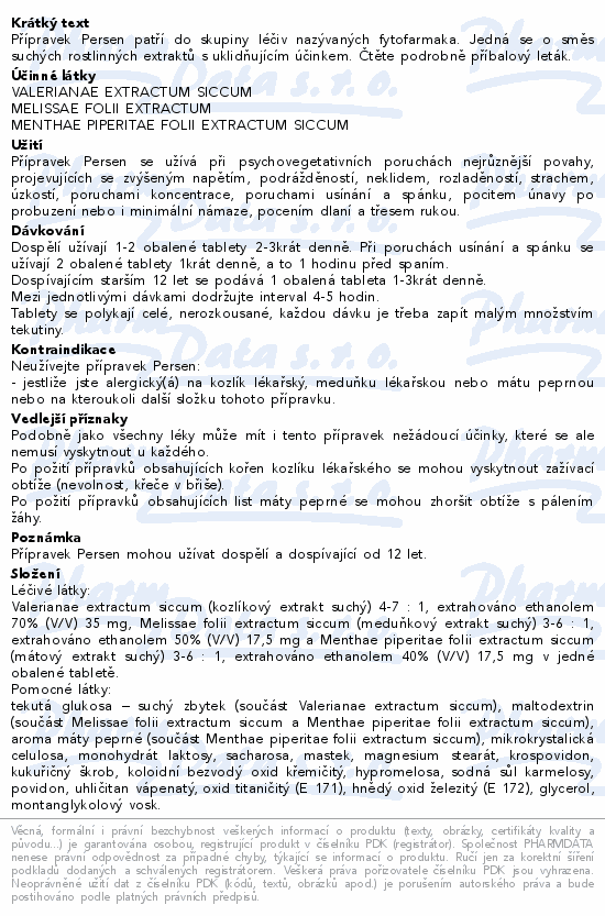 Přípravek Persen patří do skupiny léčiv nazývaných fytofarmaka. Jedná se o směs suchých rostlinných extraktů s uklidňujícím účinkem. Čtěte pozorně příbalový leták.