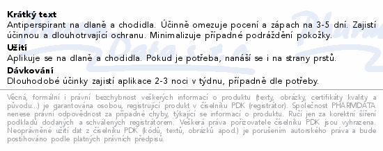 Antiperspirant na dlaně a chodidla. Účinně omezuje pocení a zápach na 3-5 dní. Zajistí účinnou a dlouhotrvající ochranu. Minimalizuje případné podráždění pokožky.