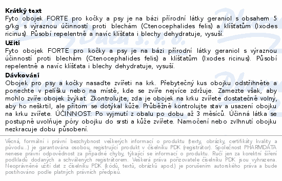 Fyto obojek FORTE pro kočky a psy je na bázi přírodní látky geraniol s obsahem 5 g/kg s výraznou účinností proti blechám (Ctenocephalides felis) a klíšťatům (Ixodes ricinus). Působí repelentně a navíc klíšťata i blechy dehydratuje, vysuší.