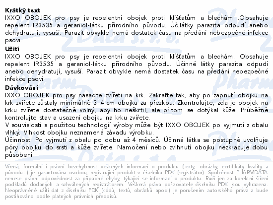 IXXO OBOJEK pro psy je repelentní obojek proti klíšťatům a blechám .Obsahuje repelent IR3535 a geraniol-látku přírodního původu. Úč.látky parazita odpudí anebo dehydratují, vysuší. Parazit obvykle nemá dostatek času na předání nebezpečné infekce psovi.