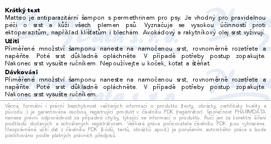 Matteo je antiparazitární šampon s permethrinem pro psy. Je vhodný pro pravidelnou péči o srst a kůži všech plemen psů. Vyznačuje se vysokou účinností proti ektoparazitům, například klíšťatům i blechám. Avokádový a rakytníkový olej srst vyživují.