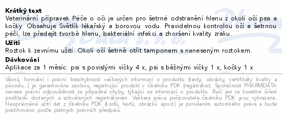 Veterinární přípravek Péče o oči je určen pro šetrné odstranění hlenu z okolí očí psa a kočky. Obsahuje Světlík lékařský a borovou vodu. Pravidelnou kontrolou očí a šetrnou péči, lze předejít tvorbě hlenu, bakteriální infekci a zhoršení kvality zraku.