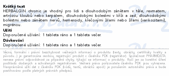 HERBALGIN chronic je vhodný pro lidi s dlouhodobým zánětem v těle, revmatem, artrózou kloubů nebo karpálem, dlouhodobými bolestmi v kříži a zad, dlouhodobými bolestmi nebo zánětem nervů, hemeroidy, křečovými žilami nebo žílami (varikozitami), migrénou.