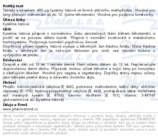 Tablety s obsahem 400 µg kyseliny listové ve formě aktivního methylfolátu. Vhodné pro ženy plánující otěhotnění až do 12. týdne těhotenství. Vhodné pro podporu krvetvorby.
