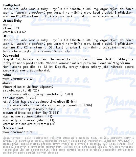 Dobré pro vaše kosti a zuby - nyní s K2! Obsahuje 500 mg organických sloučenin vápníku. Vápník je potřebný pro udržení normálního stavu kostí a zubů. S přídavkem vitaminu K1, K2 a vitaminu D3, který přispívá k normálnímu vstřebávání vápníku.