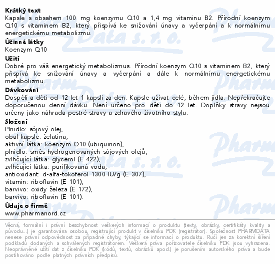 Kapsle s obsahem 100 mg koenzymu Q10 a 1,4 mg vitaminu B2. Přírodní koenzym Q10 s vitaminem B2, který přispívá ke snižování únavy a vyčerpání a k normálnímu energetickému metabolizmu.