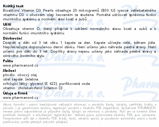 Bioaktivní Vitamin D3 Pearls obsahuje 20 mikrogramů (800 IU) vysoce vstřebatelného vitaminu D3 v olivovém oleji lisovaném za studena. Pomáhá udržovat správnou funkci imunitního systému a normální stav kostí a zubů.