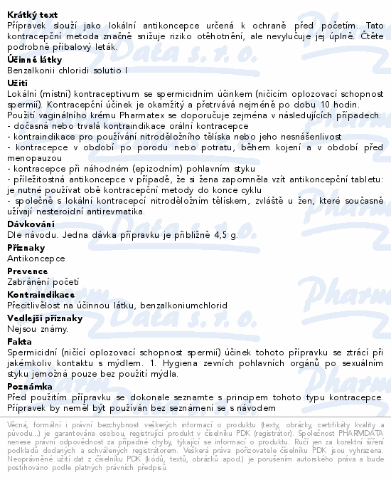 Přípravek Pharmatex vaginální krém je určen pro lokální (místní) kontracepci. Tato kontracepční metoda značně snižuje riziko otěhotnění, ale nevylučuje jej úplně: účinnost metody se zvyšuje správným dodržováním pokynů k použití (viz příbalová informace).