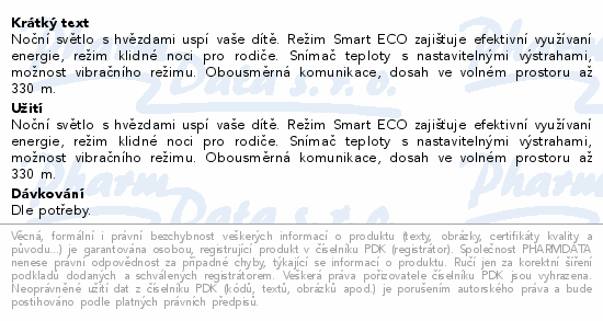 Noční světlo s hvězdami uspí vaše dítě. Režim Smart ECO zajišťuje efektivní využívaní energie, režim klidné noci pro rodiče. Snímač teploty s nastavitelnými výstrahami, možnost vibračního režimu. Obousměrná komunikace, dosah ve volném prostoru až 330 m.