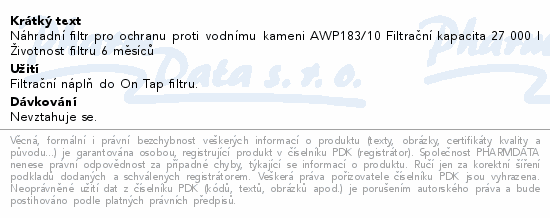 Náhradní filtr pro ochranu proti vodnímu kameni AWP183/10 Filtrační kapacita 27 000 l Životnost filtru 6 měsíců