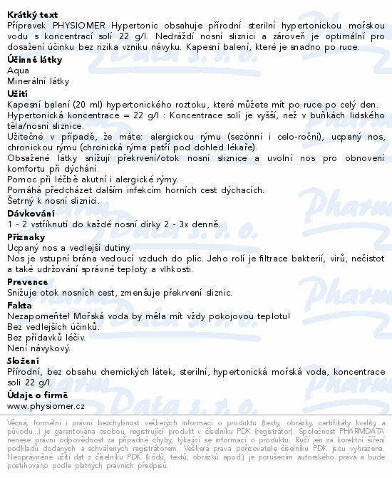 Přípravek PHYSIOMER Hypertonic obsahuje přírodní sterilní hypertonickou mořskou vodu s koncentrací solí 22 g/l. Nedráždí nosní sliznici a zároveň je optimální pro dosažení účinku bez rizika vzniku návyku. Kapesní balení, které je snadno po ruce.