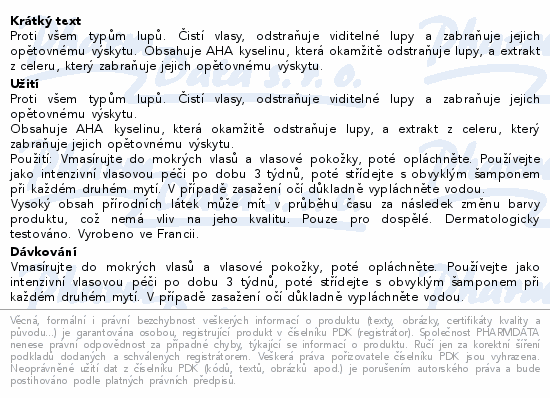 Proti všem typům lupů. Čistí vlasy, odstraňuje viditelné lupy a zabraňuje jejich opětovnému výskytu. Obsahuje AHA kyselinu, která okamžitě odstraňuje lupy, a extrakt z celeru, který zabraňuje jejich opětovnému výskytu.
