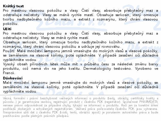 Pro mastnou vlasovou pokožku a vlasy. Čistí vlasy, absorbuje přebytečný maz a odstraňuje nečistoty. Vlasy se méně rychle mastí. Obsahuje sarkosin, který omezuje tvorbu nadbytečného kožního mazu, a extrakt z rozmarýnu, který chrání vlasovou pokožku.