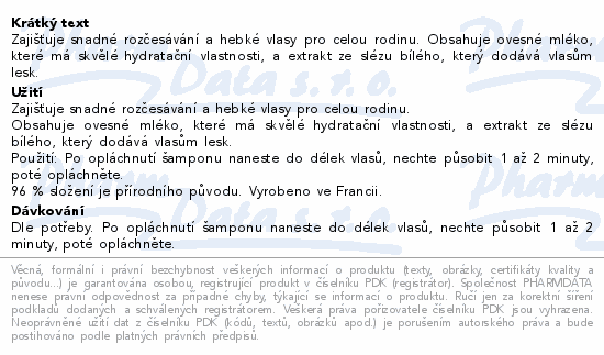 Zajišťuje snadné rozčesávání a hebké vlasy pro celou rodinu. Obsahuje ovesné mléko, které má skvělé hydratační vlastnosti, a extrakt ze slézu bílého, který dodává vlasům lesk.