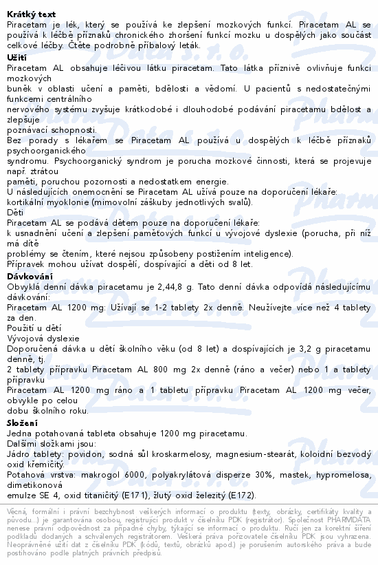 Piracetam je lék, který se používá ke zlepšení mozkových funkcí. Piracetam AL se používá k léčbě příznaků chronického zhoršení funkcí mozku u dospělých jako součást celkové léčby. Čtěte pozorně příbalový leták.