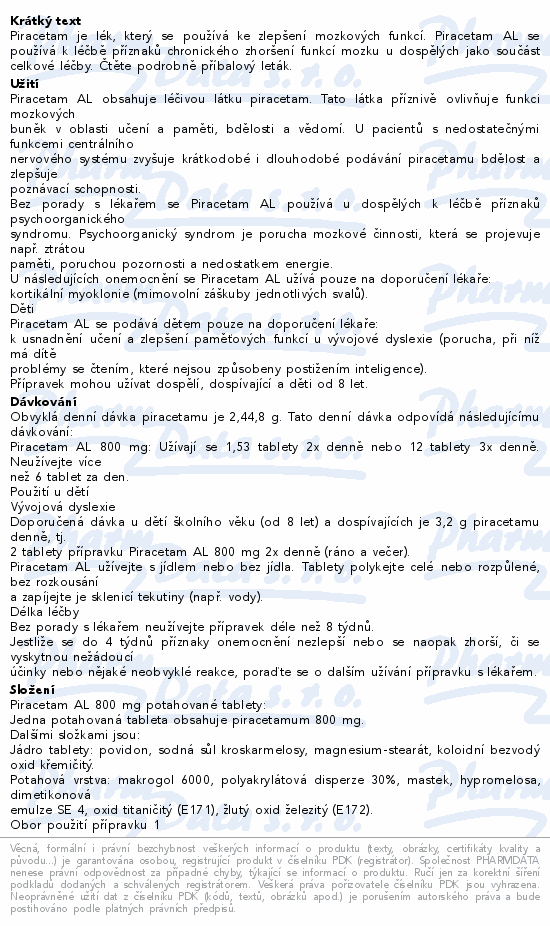 Piracetam je lék, který se používá ke zlepšení mozkových funkcí. Piracetam AL se používá k léčbě příznaků chronického zhoršení funkcí mozku u dospělých jako součást celkové léčby. Čtěte pozorně příbalový leták.