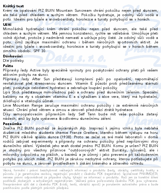 Krém na opalování PIZ BUIN Mountain Suncream chrání pokožku nejen před sluncem, ale také před chladem a suchým větrem. Pokožku hydratuje, je odolný vůči vodě a potu. Ideální pro lyžaře a snowboardisty, horolezce a turisty pohybující se v horách.