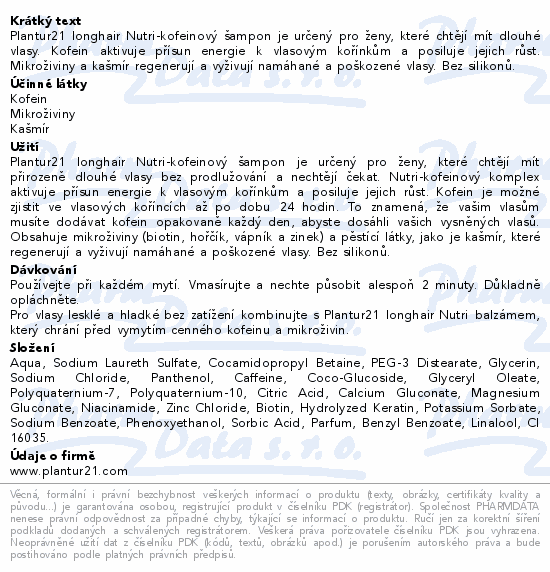 Plantur21 longhair Nutri-kofeinový šampon je určený pro ženy, které chtějí mít dlouhé vlasy. Kofein aktivuje přísun energie k vlasovým kořínkům a posiluje jejich růst. Mikroživiny a kašmír regenerují a vyživují namáhané a poškozené vlasy. Bez silikonů.