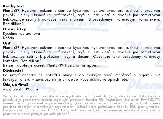 Plantur39 Hyaluron balzám s cennou kyselinou hyaluronovou pro suchou a svědivou pokožku hlavy. Usnadňuje rozčesávání, zvyšuje lesk vlasů a dodává jim sametovou hebkost. Je šetrný k pokožce hlavy a vlasům. S osvědčeným kofeinovým komplexem. Bez silikonů.