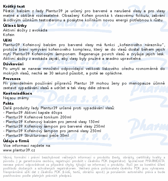 Pěstící balzám z řady Plantur39 je určený pro barvené a narušené vlasy a pro vlasy matné a obtížně rozčesatelné. Obsažený Kofein proniká k vlasovému folikulu, zabrání škodlivým účinkům testosteronu a poskytne kořínkům novou energii potřebnou k růstu.