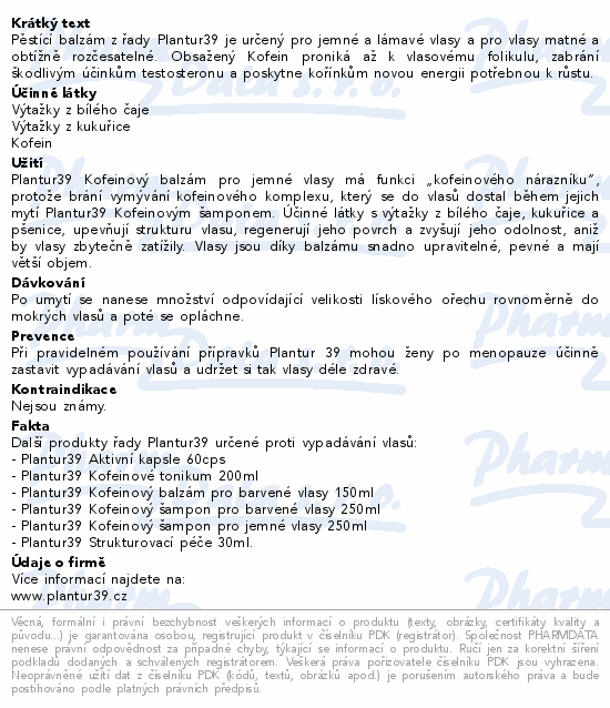Pěstící balzám z řady Plantur39 je určený pro jemné a lámavé vlasy a pro vlasy matné a obtížně rozčesatelné. Obsažený Kofein proniká až k vlasovému folikulu, zabrání škodlivým účinkům testosteronu a poskytne kořínkům novou energii potřebnou k růstu.
