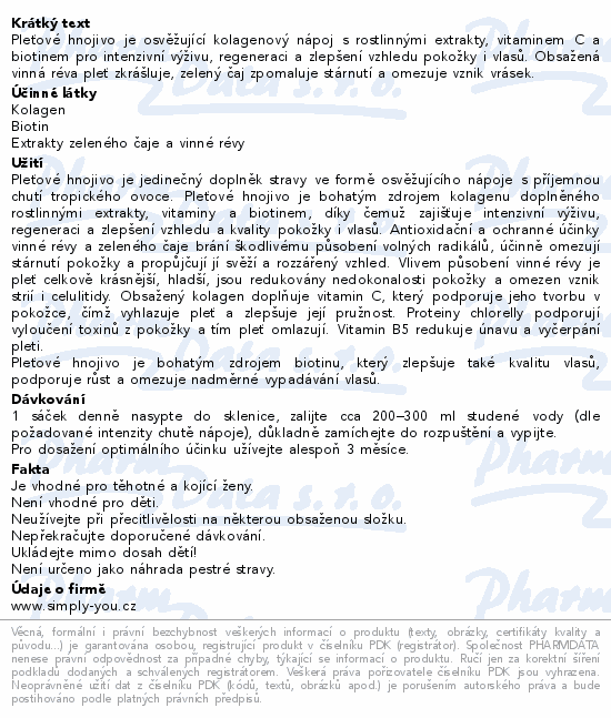Pleťové hnojivo je osvěžující kolagenový nápoj s rostlinnými extrakty, vitaminem C a biotinem pro intenzivní výživu, regeneraci a zlepšení vzhledu pokožky i vlasů. Obsažená vinná réva pleť zkrášluje, zelený čaj zpomaluje stárnutí a omezuje vznik vrásek.