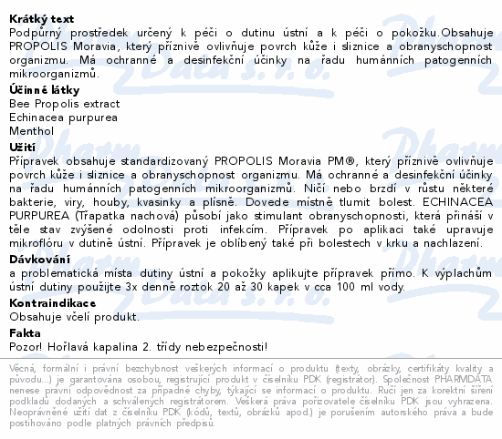Podpůrný prostředek určený k péči o dutinu ústní a k péči o pokožku.Obsahuje PROPOLIS Moravia, který příznivě ovlivňuje povrch kůže i sliznice a obranyschopnost organizmu. Má ochranné a desinfekční účinky na řadu humánních patogenních mikroorganizmů.