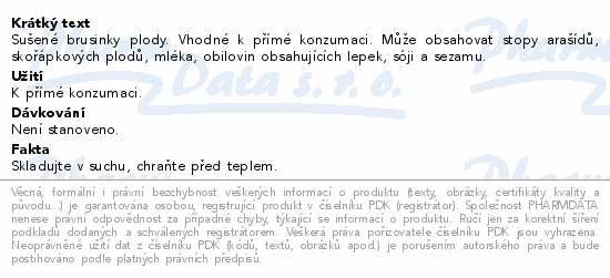 Sušené brusinky plody. Vhodné k přímé konzumaci. Může obsahovat stopy arašídů, skořápkových plodů, mléka, obilovin obsahujících lepek, sóji a sezamu.