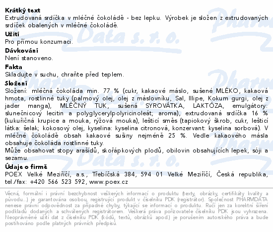 Extrudovaná srdíčka v mléčné čokoládě - bez lepku. Výrobek je složen z extrudovaných srdíček obalených v mléčné čokoládě.