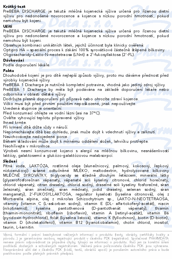 PreBEBA DISCHARGE je tekutá mléčná kojenecká výživa určená pro řízenou dietní výživu pro nedonošené novorozence a kojence s nízkou porodní hmotností, pokud nemohou být kojeni.