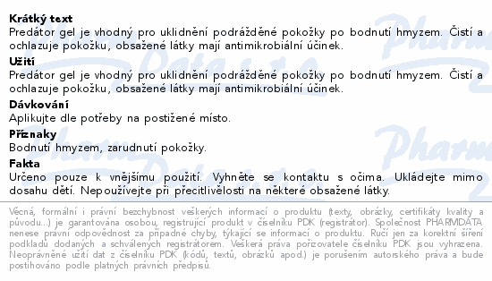 Predátor gel je vhodný pro uklidnění podrážděné pokožky po bodnutí hmyzem. Čistí a ochlazuje pokožku, obsažené látky mají antimikrobiální účinek.