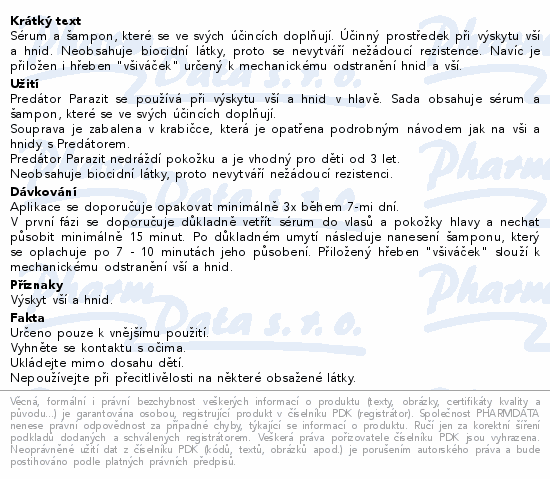 Predator Parazit je sada funkčního séra a šamponu, které společně napomáhají bojovat proti vším a hnidám při jejich výskytu ve vlasech. Neobsahuje žádné biocidní látky a nedochází tak k vytváření odolnosti parazitů proti přípravku. Predator Parazit funguje na principu lokálního udušení, díky obsahu směsi přírodních silic, a zároveň působí proti chuti vši sát. Sérum dokonale zbaví vlasy vší a hnid a umožní jejich snadné rozčesávání. Má kondiciační účinky, zabraňuje nadměrnému svědění a vysychání pokožky. Snižuje lámavost vlasů a dodává jim svěží pocit čistoty. Šampon pak slouží k důkladnému vymytí séra z vlasů a zároveň je udrží v dobré kondici. Je pouze jemně parfemovaný a nedráždí tak pokožku. Součástí sady je hřeben "všiváček" zdarma.