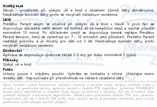 Sérum - prostředek při výskytu vší a hnid s obsahem účinné látky dimethicone. Neobsahuje biocidní látky, proto se nevytváří nežádoucí rezistence.