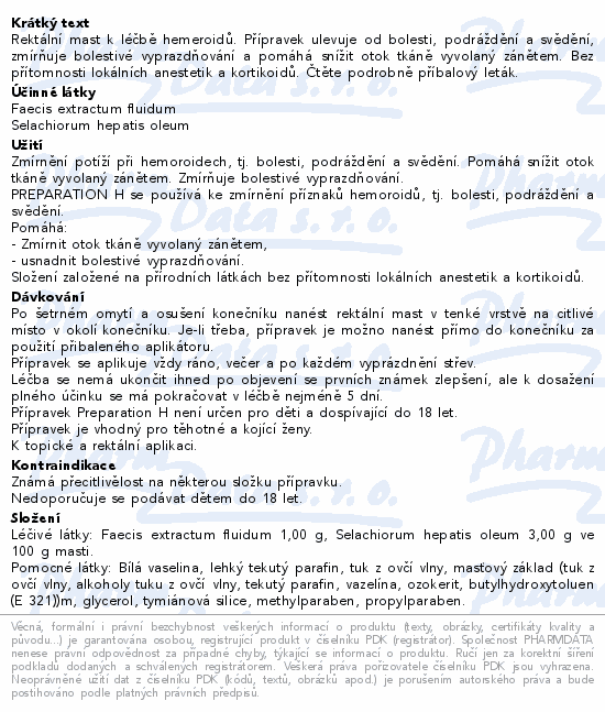 Pečlivě čtěte příbalovou informaci. PREPARATION H rektální mast je léčivý přípravek k topické a rektální aplikaci. Přípravek Preparation H není určen pro děti a dospívající do 18 let.