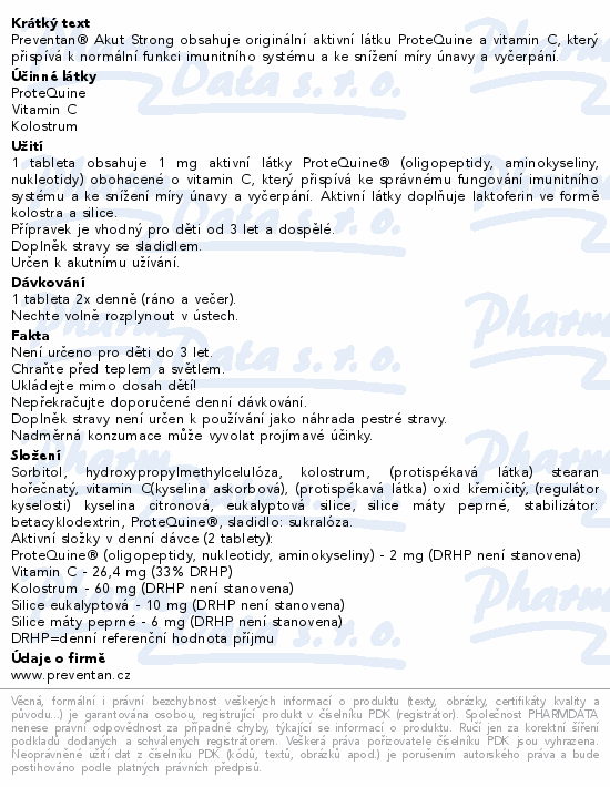 Preventan® Akut Strong obsahuje originální aktivní látku ProteQuine a vitamin C, který přispívá k normální funkci imunitního systému a ke snížení míry únavy a vyčerpání.
