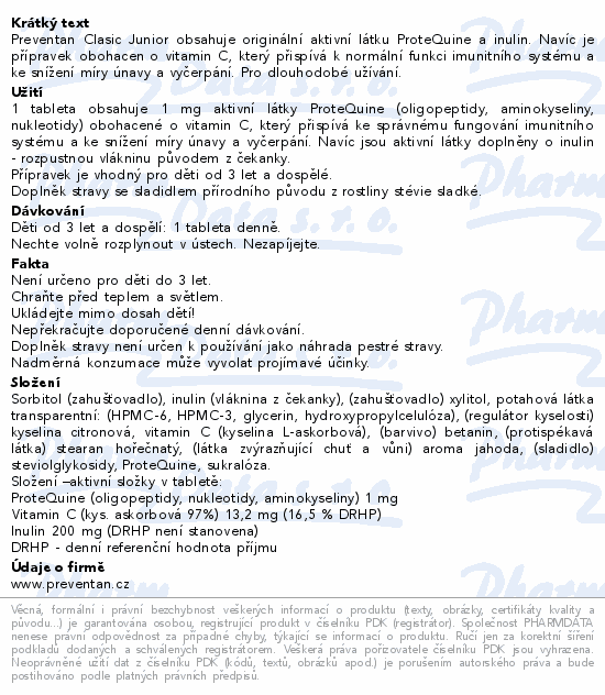 Preventan Clasic Junior obsahuje originální aktivní látku ProteQuine a inulin. Navíc je přípravek obohacen o vitamin C, který přispívá k normální funkci imunitního systému a ke snížení míry únavy a vyčerpání. Pro dlouhodobé užívání.