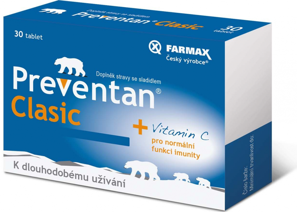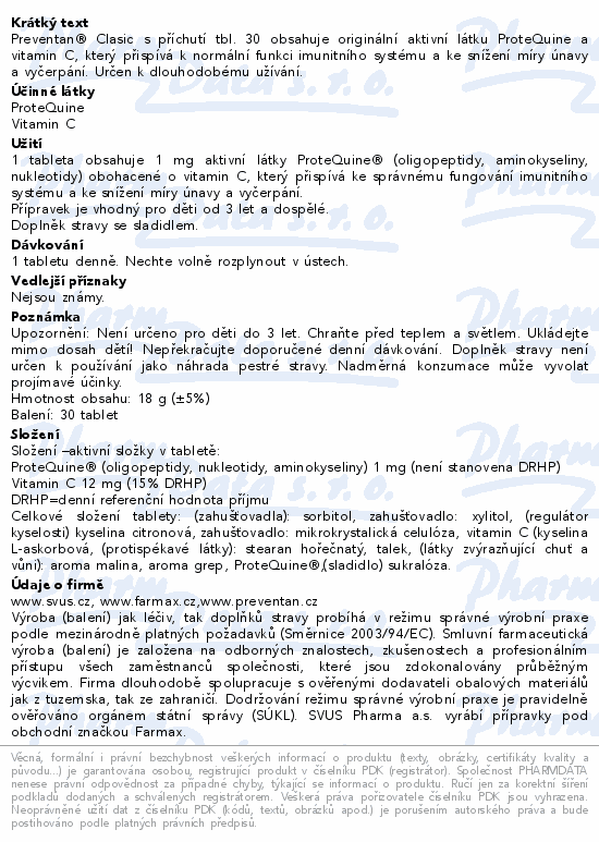 Preventan® Clasic s příchutí tbl. 30 obsahuje originální aktivní látku ProteQuine a vitamin C, který přispívá k normální funkci imunitního systému a ke snížení míry únavy a vyčerpání. Určen k dlouhodobému užívání.