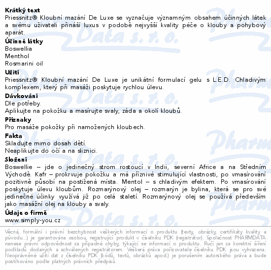 Priessnitz® Kloubní mazání De Luxe se vyznačuje významným obsahem účinných látek a svému uživateli přináší luxus v podobě nejvyšší kvality péče o klouby a pohybový aparát.