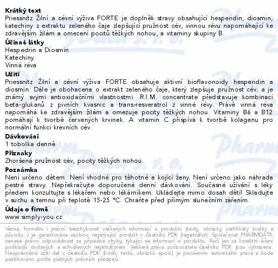 Priessnitz Žilní a cévní výživa FORTE je doplněk stravy obsahující hesperidin, diosmin, katechiny z extraktu zeleného čaje zlepšující pružnost cév, vinnou révu napomáhající ke zdravějším žilám a omezení pocitů těžkých nohou, a vitaminy skupiny B.
