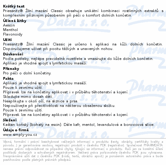 Priessnitz® Žilní mazání Classic obsahuje unikátní kombinaci rostlinných extraktů s komplexním příznivým působením při péči o komfort dolních končetin.