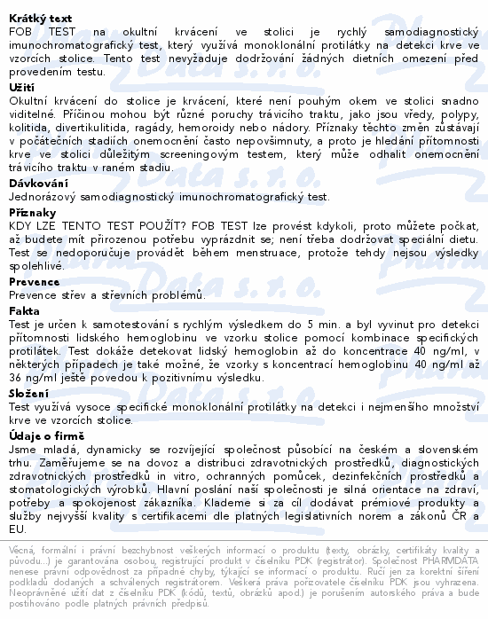 FOB TEST na okultní krvácení ve stolici je rychlý samodiagnostický imunochromatografický test, který využívá monoklonální protilátky na detekci krve ve vzorcích stolice. Tento test nevyžaduje dodržování žádných dietních omezení před provedením testu.
