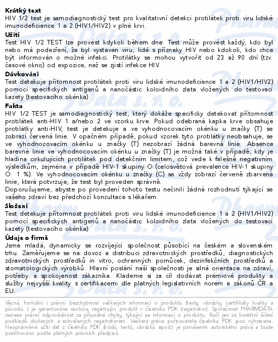 HIV 1/2 test je samodiagnostický test pro kvalitativní detekci protilátek proti viru lidské imunodeficience 1 a 2 (HIV1/HIV2) v plné krvi.