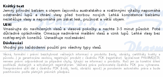 Jemný přírodní balzám s olejem čajovníku australského a rostlinnými výtažky napomáhá odstranění lupů a chrání vlasy před tvorbou nových. Lehká konzistence balzámu nezatěžuje vlasy a napomáhá jim získat lesk, pružnost a větší objem.