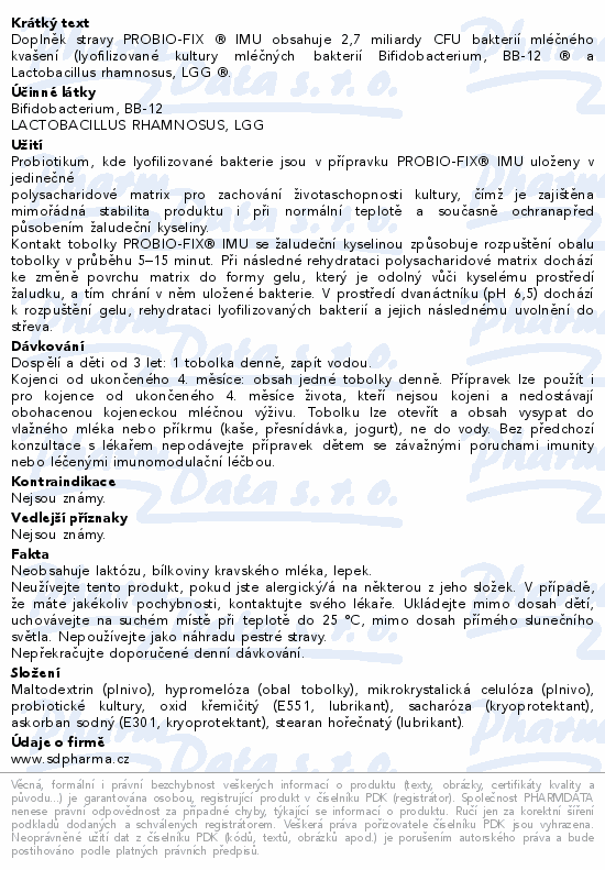 Doplněk stravy PROBIO-FIX ® IMU obsahuje 2,7 miliardy CFU bakterií mléčného kvašení (lyofilizované kultury mléčných bakterií Bifidobacterium, BB-12 ® a Lactobacillus rhamnosus, LGG ®.