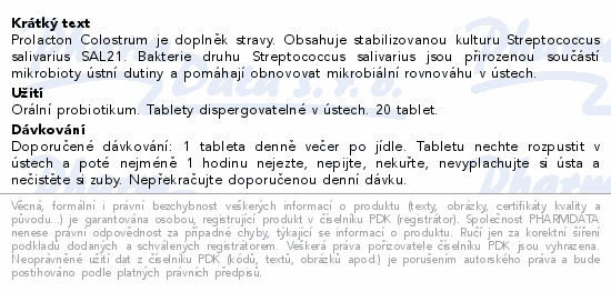 Prolacton Colostrum je doplněk stravy. Obsahuje stabilizovanou kulturu Streptococcus salivarius SAL21. Bakterie druhu Streptococcus salivarius jsou přirozenou součástí mikrobioty ústní dutiny a pomáhají obnovovat mikrobiální rovnováhu v ústech.