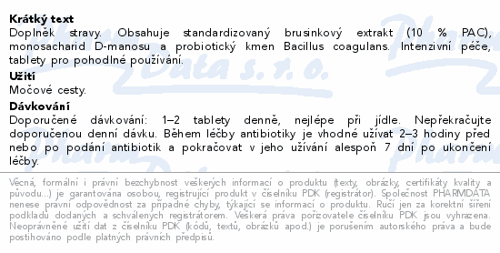 Doplněk stravy. Obsahuje standardizovaný brusinkový extrakt (10 % PAC), monosacharid D-manosu a probiotický kmen Bacillus coagulans. Intenzivní péče, tablety pro pohodlné používání.