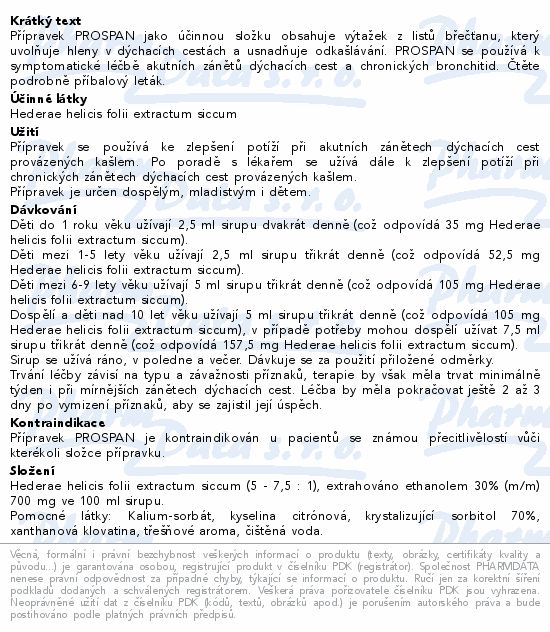 Přípravek PROSPAN jako účinnou složku obsahuje výtažek z listů břečťanu, který uvolňuje hleny v dýchacích cestách a usnadňuje odkašlávání. PROSPAN se používá k symptomatické léčbě akutních zánětů dýchacích cest a chronických bronchitid. Čtěte pozorně příbalový leták.