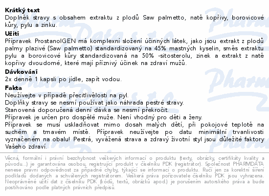 Doplněk stravy s obsahem extraktu z plodů Saw palmetto, natě kopřivy, borovicové kůry, pylu a zinku.