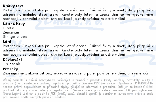 Protectum Ginkgo Extra jsou kapsle, které obsahují různé živiny a zinek, který přispívá k udržení normálního stavu zraku. Karotenoidy lutein a zeaxanthin se ve vysoké míře nacházejí v centrální oblasti sítnice, která je zodpovědná za ostré vidění.