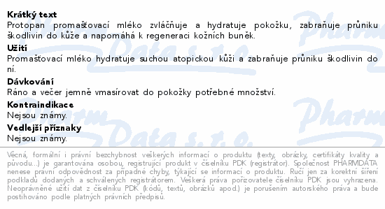 Protopan promašťovací mléko zvláčňuje a hydratuje pokožku, zabraňuje průniku škodlivin do kůže a napomáhá k regeneraci kožních buněk.